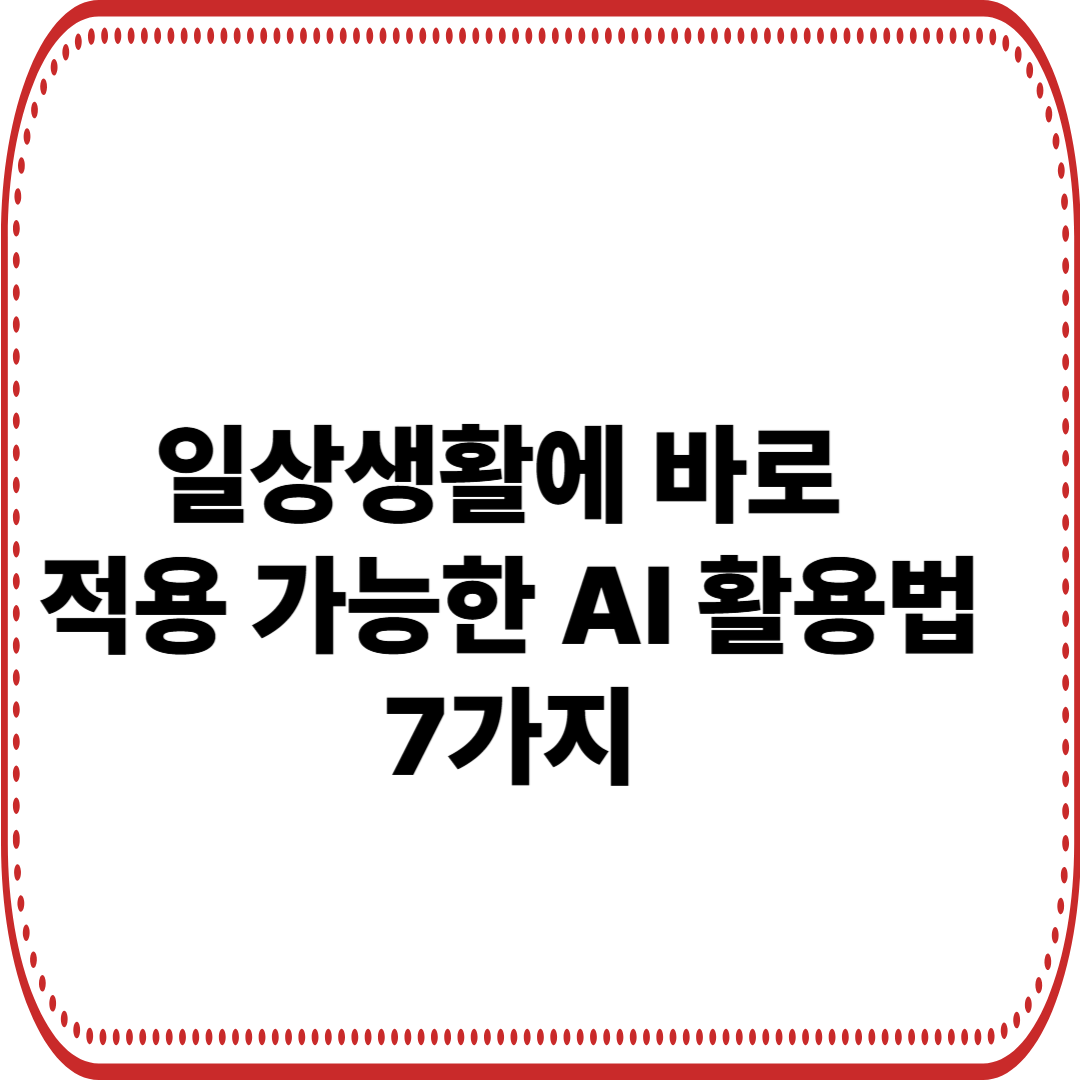 AI 기술은 이제 일상생활 곳곳에서 효율성과 편리함을 제공하며 삶의 질을 높이고 있습니다. 위에서 소개한 7가지 AI 활용법을 통해 보다 스마트하고 여유로운 라이프스타일을 직접 경험해보세요.