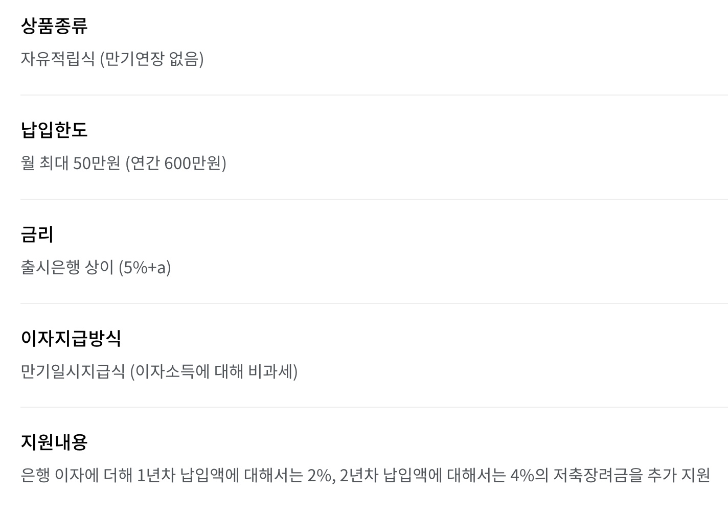 - 만기 시 이자+정부 ‘저축장려금’ + 이자소득 비과세 혜택 제공