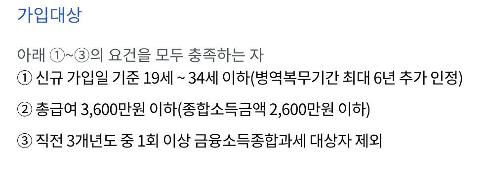 | 연령 | 만 19세 이상 ~ 만 34세 이하 (병역 이행기간 최대 6년 인정) |