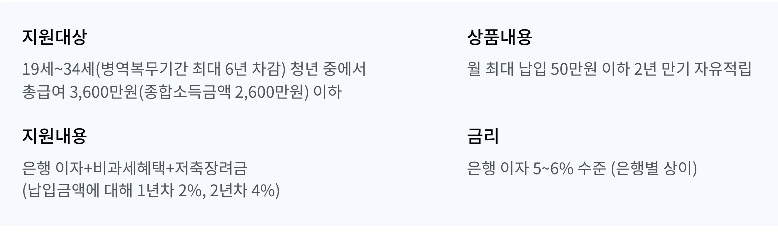 - 목적: 19~34세 청년의 목돈 형성을 위해 정부와 은행이 지원하는 2년 만기 자유적립 적금