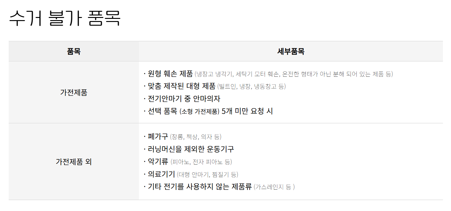- 에어컨, 벽걸이 TV 등 설치된 제품은 철거 후 수거가 가능합니다.