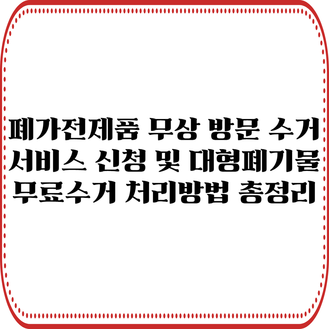 폐가전제품 무상 방문 수거 서비스는 가정에서 발생하는 대형 가전제품을 효율적으로 처리할 수 있는 방법입니다. 수거 가능 품목과 불가 품목을 정확히 확인하고, 지정된 절차에 따라 신청하면 편리하게 서비스를 이용할 수 있습니다. 또한, 대형폐기물 처리 방법을 숙지하여 가전제품과 기타 폐기물을 적절히 분리 배출하는 것이 중요합니다.